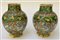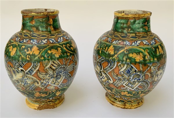 Coppia di vasi in maiolica smaltata in policromia con decoro a trofei, volute e forme geometriche (h cm 31) (difetti e mancanze)
