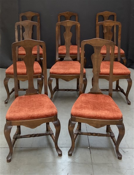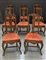 Gruppo di otto sedie con gambe anteriori mosse riunite da traverse e schienali a giorno, sedute asportabili (difetti)