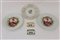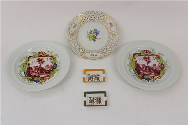Lotto composto da un piatto traforato della manifattura di Meissen, due piccoli posaceneri Hermes e una coppia di piatti in porcellana decorata in policromia