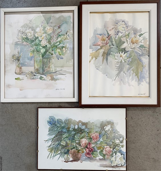 M. Samonà Furcht, lotto composto da tre acquerelli su carta ed un olio su tela circolare raffiguranti fiori, misure diverse, in cornici