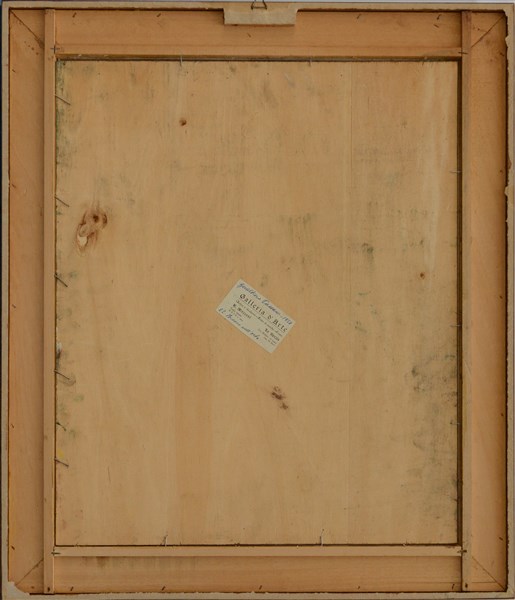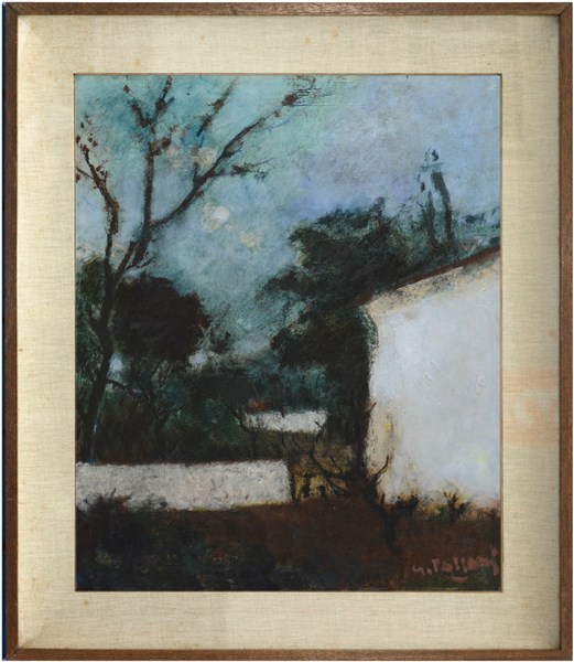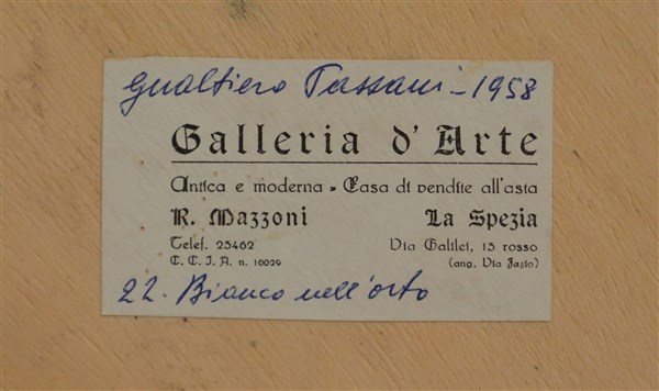 "Bianco nell'orto", olio su compensato (cm 60x50), firmato in basso a destra. Al retro etichetta della "Galleria d'Arte R. Mazzoni - La Spezia"