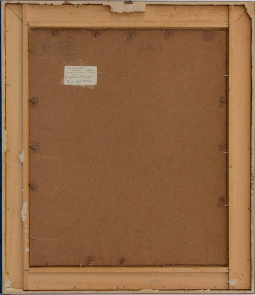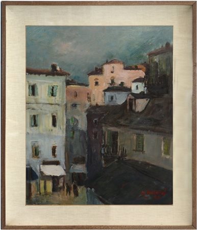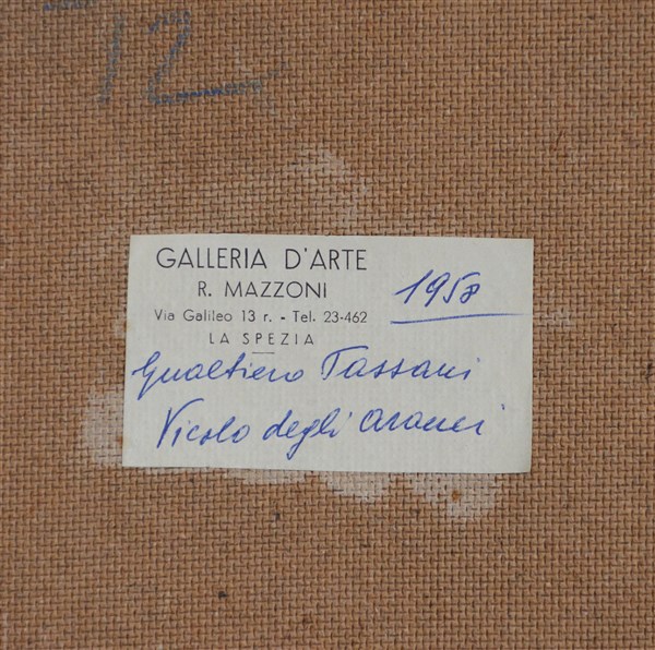 "Vicolo degli aranci" 1957, olio su masonite (cm 60x50), firmato e datato in basso a destra. Al retro etichetta della "Galleria d'Arte R. Mazzoni - La Spezia"