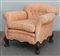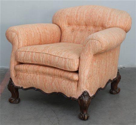 Poltrona imbottita rivestita in tessuto fiammato rosa con quattro piedi e profili alla base in legno intagliato a volute. (difetti)