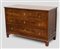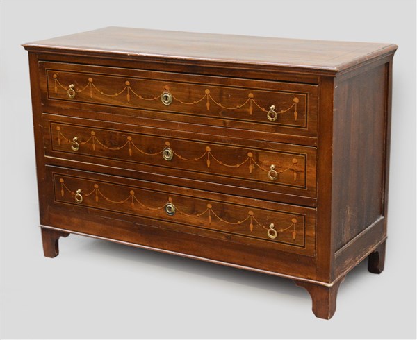 Cassettone lastronato e filettato in legni vari a tre cassetti, piedi sagomati