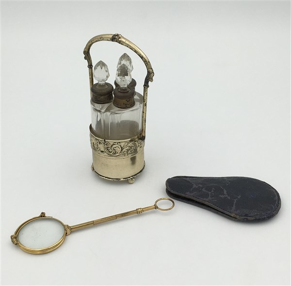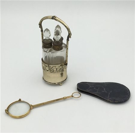 Lotto composto da un cestello con tre bottigliette in argento e vetro e una lorniette in metallo dorato in custodia (difetti)