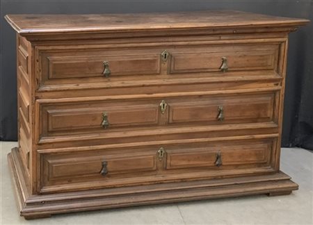 Antico cassettone a tre cassetti con fronte e fianchi pannelati (cm 148x94x66) (difetti e restauri)