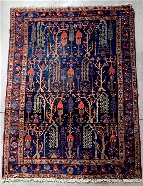 Tappeto Bachtiari, Persia, fine secolo XIX. Decorato con motivo floreale su fondo blu scuro. (Difetti) (cm 193x134)