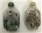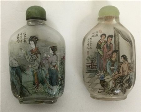 Coppia di snuff bottles in vetro decorato a figure, tappi in giada incollati (d