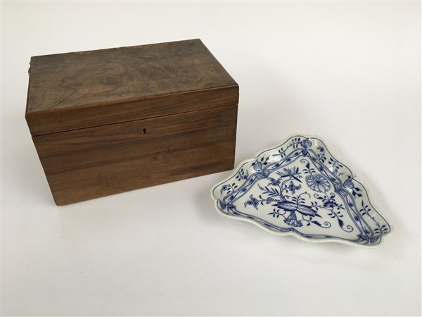 Lotto composto da un vassoietto con decorazione a "cipolla" della manifattura di Meissen, ed una scatola lastronata (cm 30x17x19) (lievi difetti)