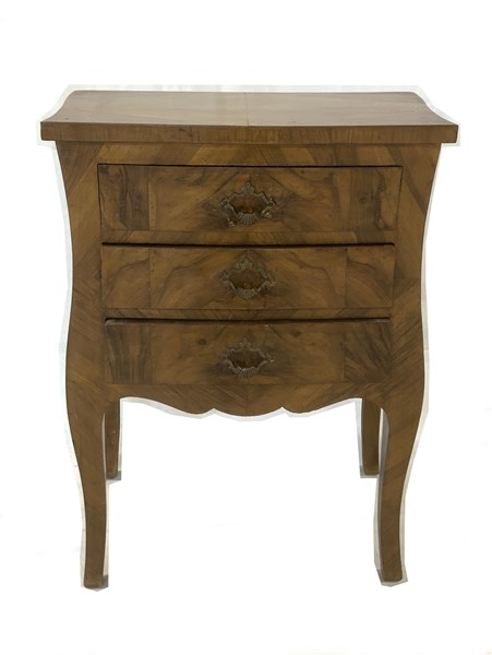 Comodino lastronato di forma mossa, tre cassetti sul fronte (cm 52x67x31) (dife
