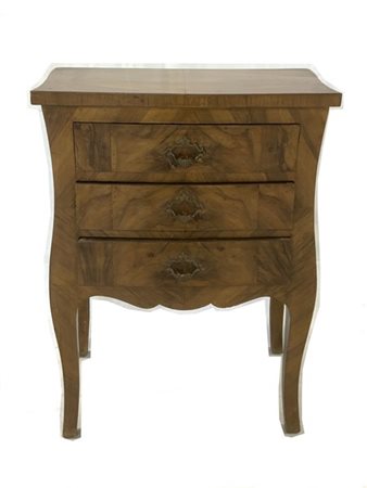 Comodino lastronato di forma mossa, tre cassetti sul fronte (cm 52x67x31) (difetti)