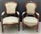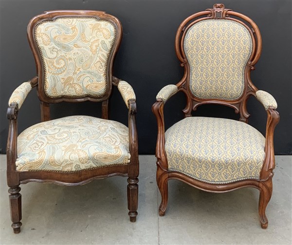 Lotto di due poltrone di forma mossa in legno intagliato con sedute e schienali rivestite in tessuto operato. Secolo XIX (difetti)