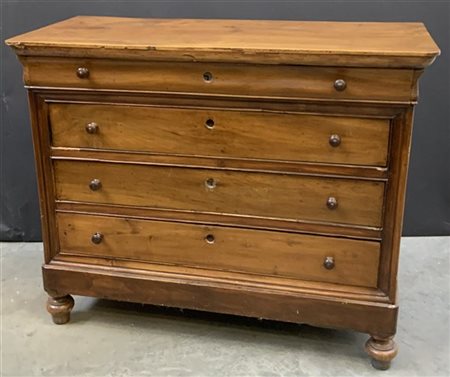 Comò in legno a tre cassetti e mezzo, piedi anteriori torniti, sec XIX (cm 117x94x56) (difetti)