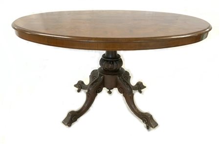 Tavolo con piano ovale con gamba centrale terminante a quattro piedi con rotelle. Secolo XIX (difetti)