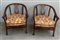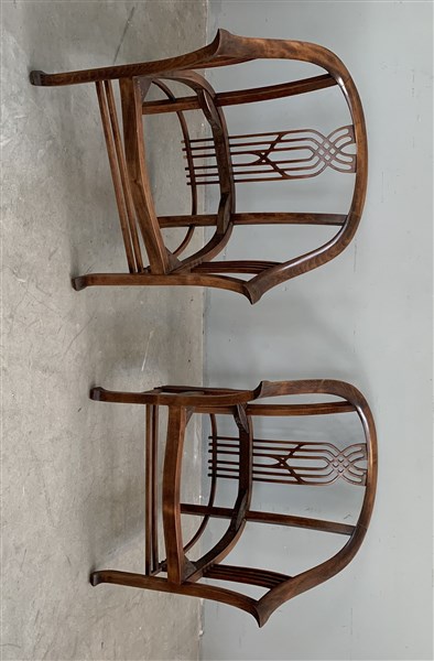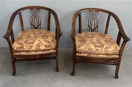 Coppia di poltrone a pozzetto in legno con schienale traforato. (cm 70x78x60) (difetti)