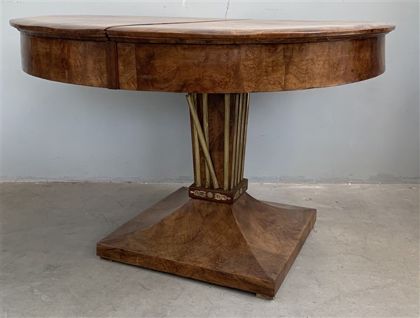 Tavolo tondo lastronato allungabile con gamba centrale decorata con filettauture in metallo dorato e fregi, base quadrata. (cm 130x83x121) (difetti)