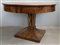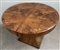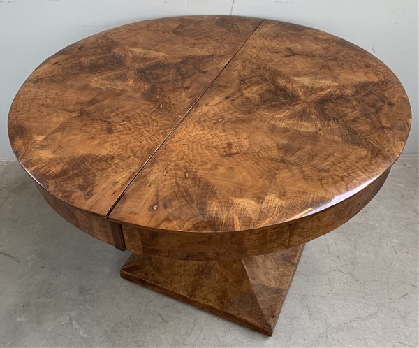 Tavolo tondo lastronato allungabile con gamba centrale decorata con filettautur