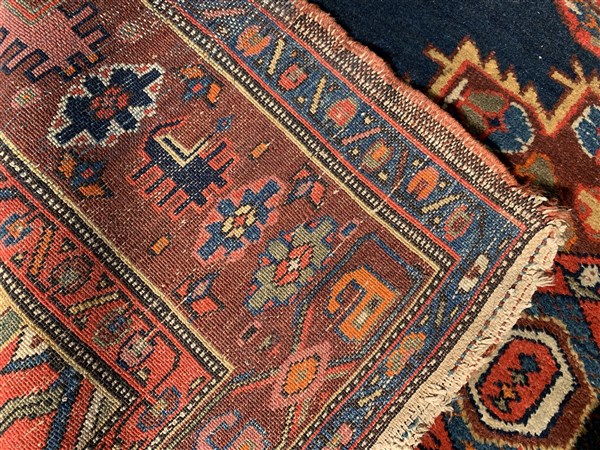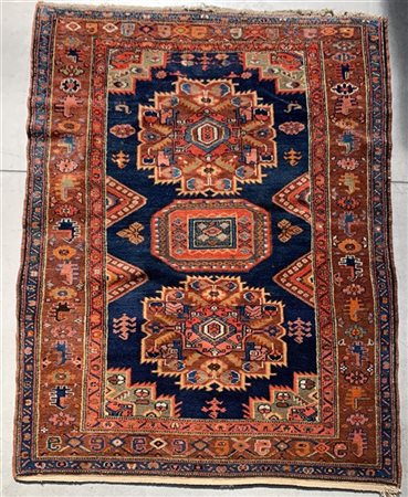 Tappeto Hamadan, Persia, Secolo XX. Decoro con due medaglioni policromi su fondo blu (Difetti) (cm 182x134)