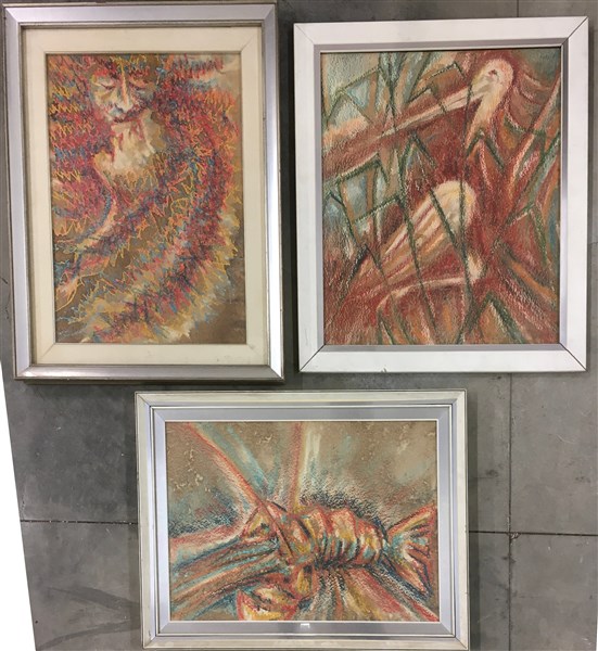 "Aragosta, Cicogna, Verso l'alto", gruppo di tre tecniche miste ad encaustio su cartoncino (cm 50x70, 70x60, 70x50) due firmati, titolati e datati 1974, in cornici