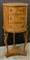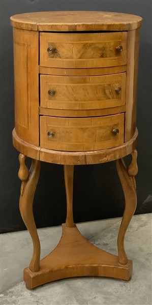 Comodino lastronato e filettato a tre cassetti radicati, gambe terminanti a testa di cigno (d cm 37, h cm 78) (difetti)