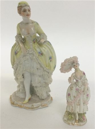 Fabbris, lotto composto da due sculturine raffiguranti dame in porcellana (h max cm 19) (Difetti, mancanze e restauri)
