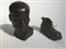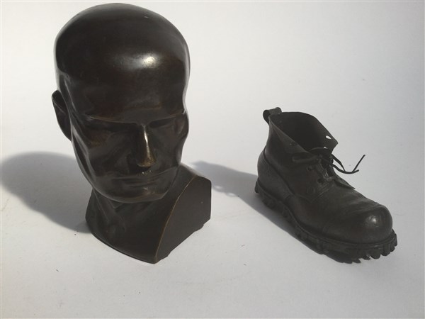 Lotto composto da due sculture in bronzo raffiguranti un volto maschile ed una scarpetta (h max cm 15) (difetti)