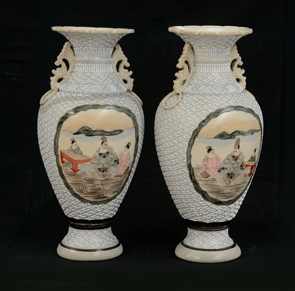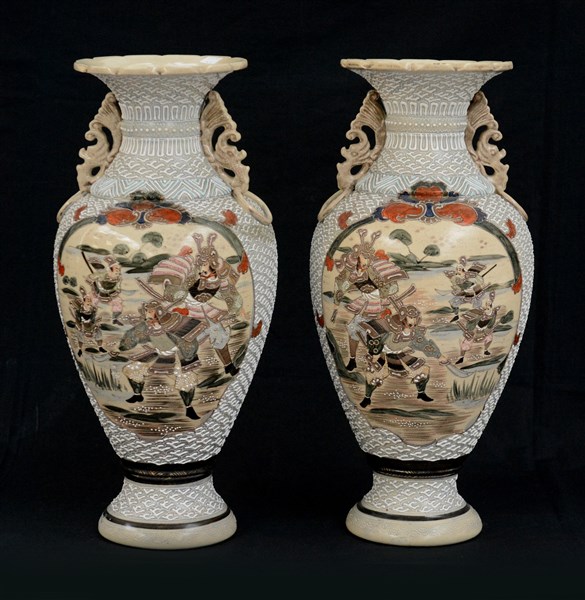 Coppia di vasi in ceramica Satsuma con anse traforate e anelli e riserve decorate con figure. Giappone, inizi sec. XX (lievi difetti)