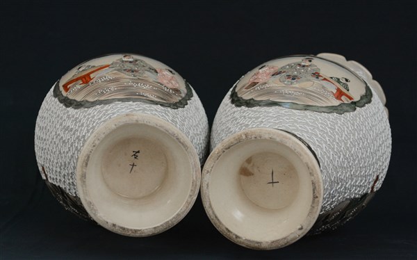 Coppia di vasi in ceramica Satsuma con anse traforate e anelli e riserve decora