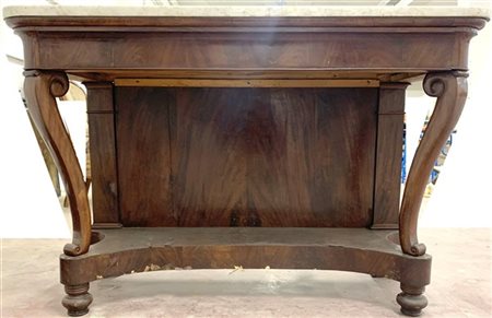 Tavolo da parete lastronato in mogano montanti mossi e cassetto nella fascia, piano in marmo bianco (cm 137,5x92x60) (difetti)
