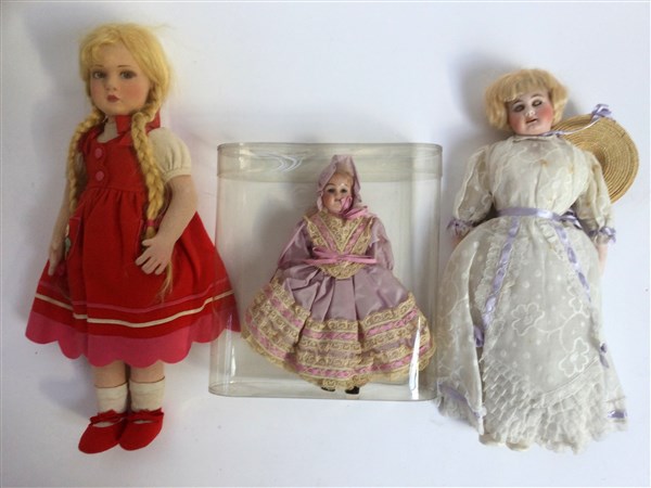 Lotto di tre bamboline di cui due in porcellana ed una in pezza (h max cm 43) (difetti)