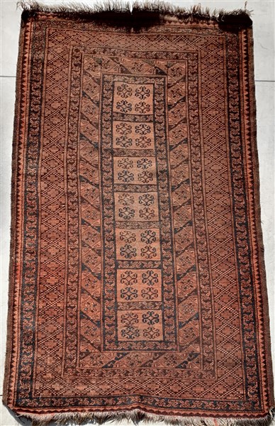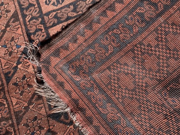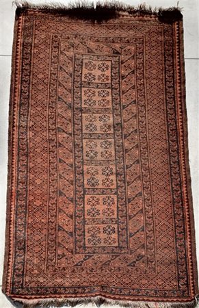 Tappeto Afghan, Turkestan Occidentale, decoro geometrico su fondo marrone (Difetti) (cm 216x121)