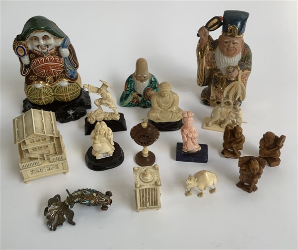 Lotto composto da sedici oggetti orientali di materiali, misure e soggetti dive