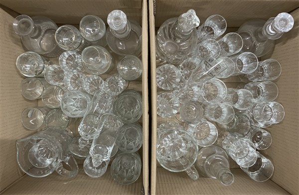 Due cartoni contenenti numerosi bicchieri in cristallo, alcune bottiglie e caraffe (difetti)