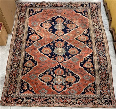 Tappeto Serabend, Persia, fine secolo XIX. Decoro con tre medaglioni a fondo blu su campo rosso fragola. Bordura Herati su fondo blu (Difetti, rapature e vecchi restauri) (cm 258x196)