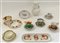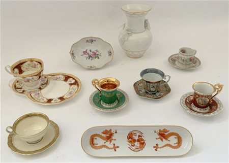 Manifatture diverse. Lotto in porcellana composto da sei tazzine con piattini, due svuotatasche e un vaso, motivi decorativi differenti (difetti)