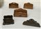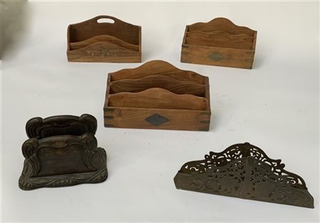 Gruppo di cinque portalettere in legno e metallo (l max cm 30) (difetti)