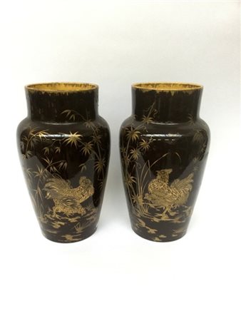Coppia di vasi in ceramica decorati con figure di galletti e arbusti fogliati in oro (h cm 35).