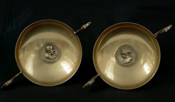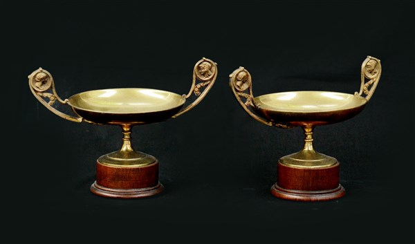Coppia di alzatine in bronzo dorato su base in legno (h cm 15) (difetti)