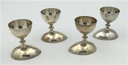 Gruppo di quattro porta uovo in argento su basi a guscio. Titolo 800. Firenze. Argentiere Brandimarte (h. cm 8) (g 250)
