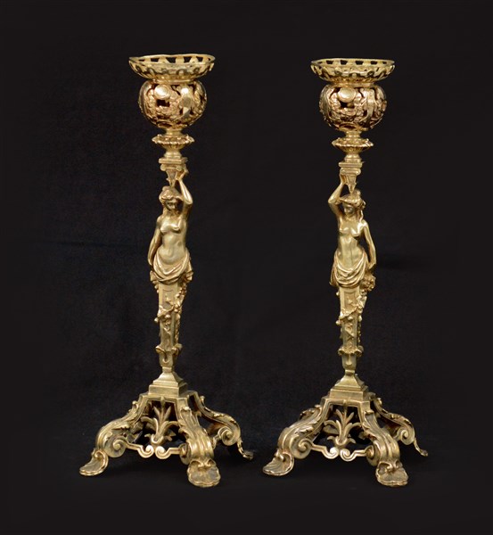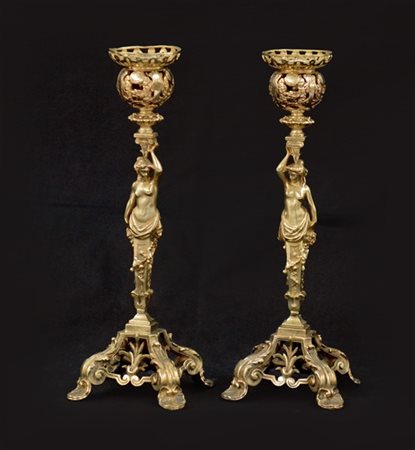 Coppia di candelieri in bronzo corpo a figura di donna a tutto tondo (h cm 29,5) (difetti)