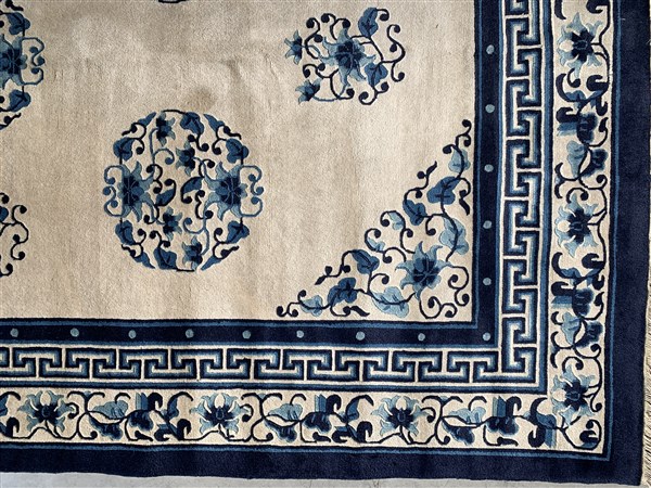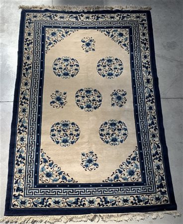 Tappeto Cina, Secolo XX. Decoro con piccoli medaglioni tondeggianti, decorati con peonie su fondo beige (Lievi difettI) (cm 250x156)