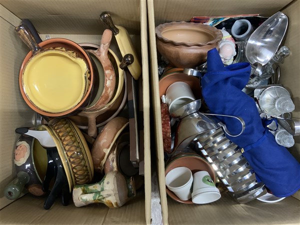 Due cartoni contenenti numerosi oggetti per la tavola in ceramica ed altri mate