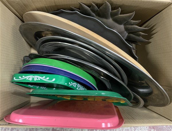 Cartone contenente numerosi vassoi in metallo, alcuni serigrafati (difetti)