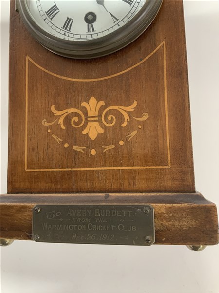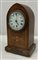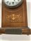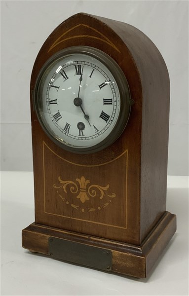 Orologio in legno con cassa arquata ad intarsio, quadrante bianco a cifre romane, movimento solo tempo.