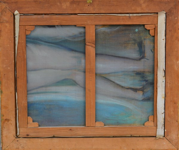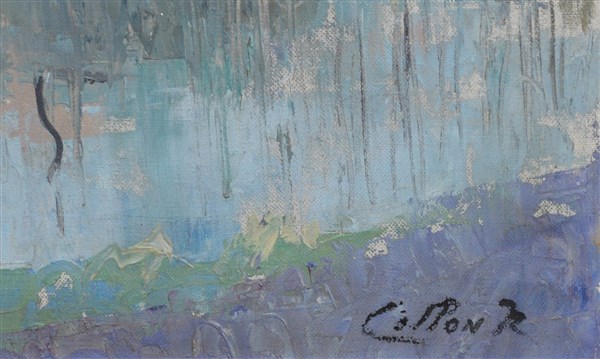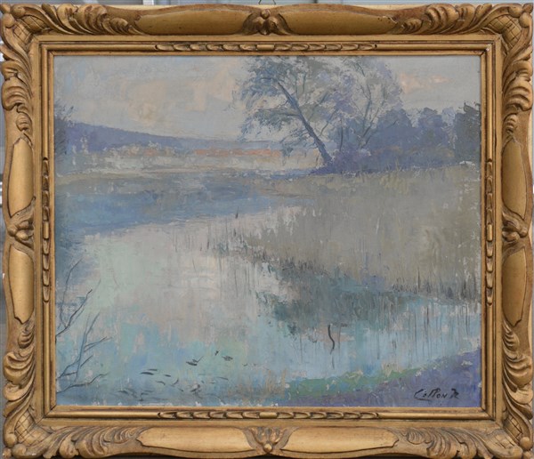 Firma indecifrata "Paesaggio fluviale" olio su tela (cm 50x60) Firmato e datato in basso a destra. In cornice