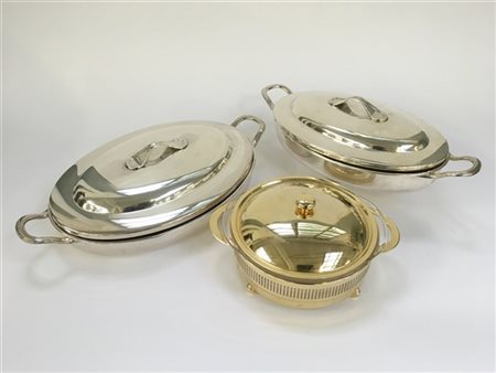 Lotto composto da due pesciere biansate di diverse dimensioni, una con vassoio interno in vetro, unite ad una zuppiera, in metallo argentato e dorato (mancanze)