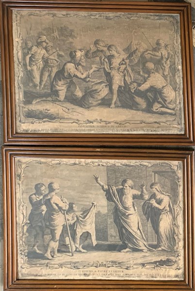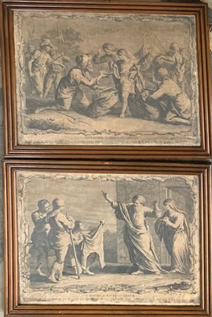 Coppia di antiche incisioni raffiguranti scene religiose (fogli cm 41x52), in cornici (gravi difetti)