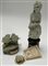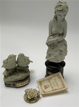 Lotto composto da due sculture in bisquit raffiguranti "Bustino Elen" e coppia di pettirossi firmate "G. Visentin" unite ad una placchetta in porcellana (difetti)