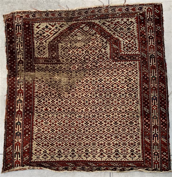 Tappeto preghiera Ersari, Turkestan occidentale, prima metà secolo XIX. Il decoro a griglia policromo su fondo bianco deriva dai tappeti preghiera Daghestan, essendo la tribù Ersari di stanza anticamente in una regione caucasica del Mar Caspio (cm 123x120) (difetti, rapature, mancanze e vecchi restauri)