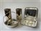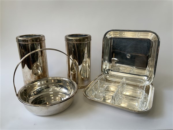 Lotto composto da un cestino e un'antipastiera con coperchio e vaschette in vetro e due glacette in metallo argentato, marcati "Cesa 1882